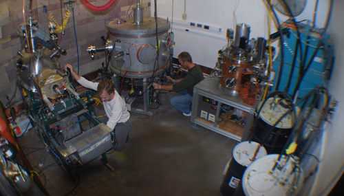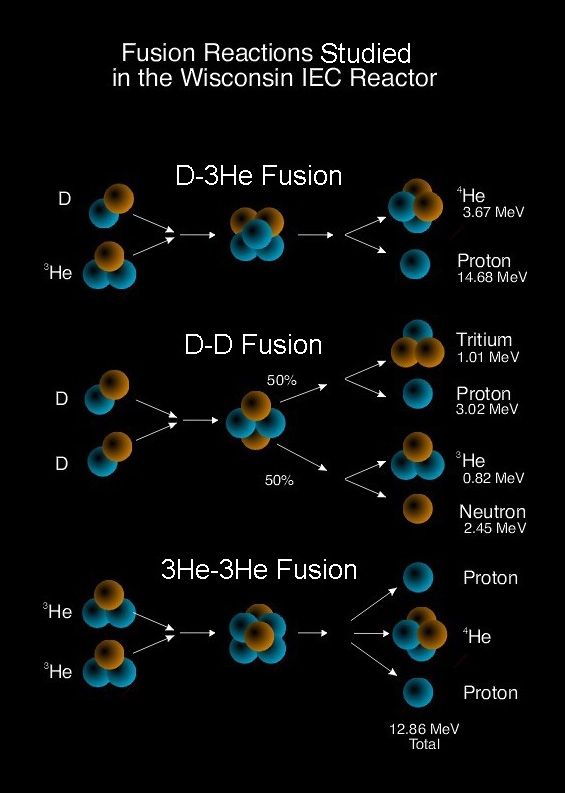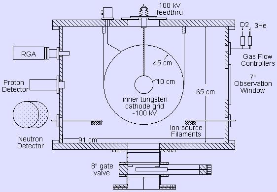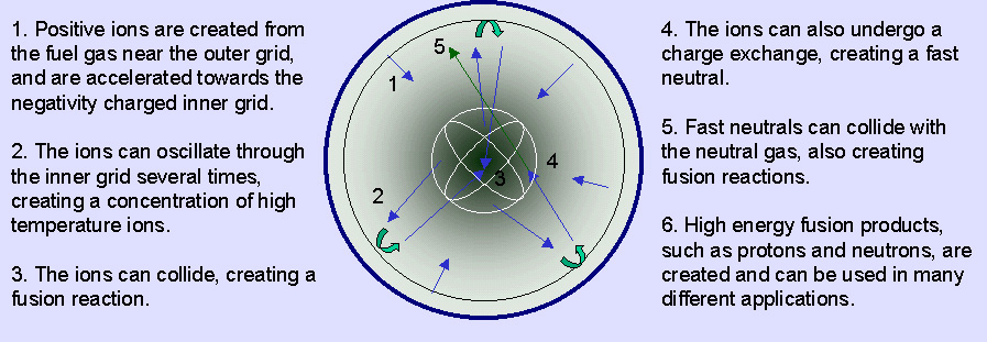 The IEC reactor is a vacuum chamber filled with a fuel gas such as deuterium at low pressure. There are inner and outer spherical or cylindrical grids centered inside the chamber. The outer grid is held at nearly zero potential, and the inner, 90-99% transparent grid is held at a high negative potential, typically -100 kV. The potential difference between the grids accelerates ions inward to velocities of fusion relevance.