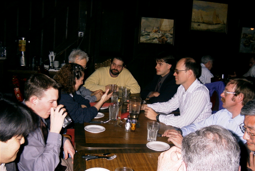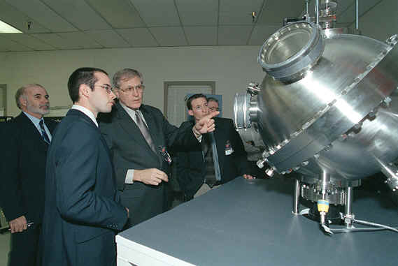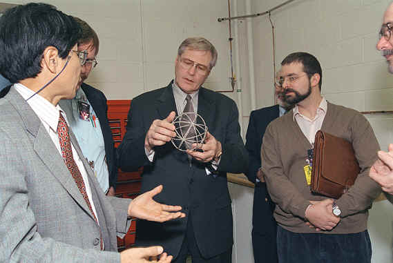 | Looking at spherical chamber | Discussing grid designs |